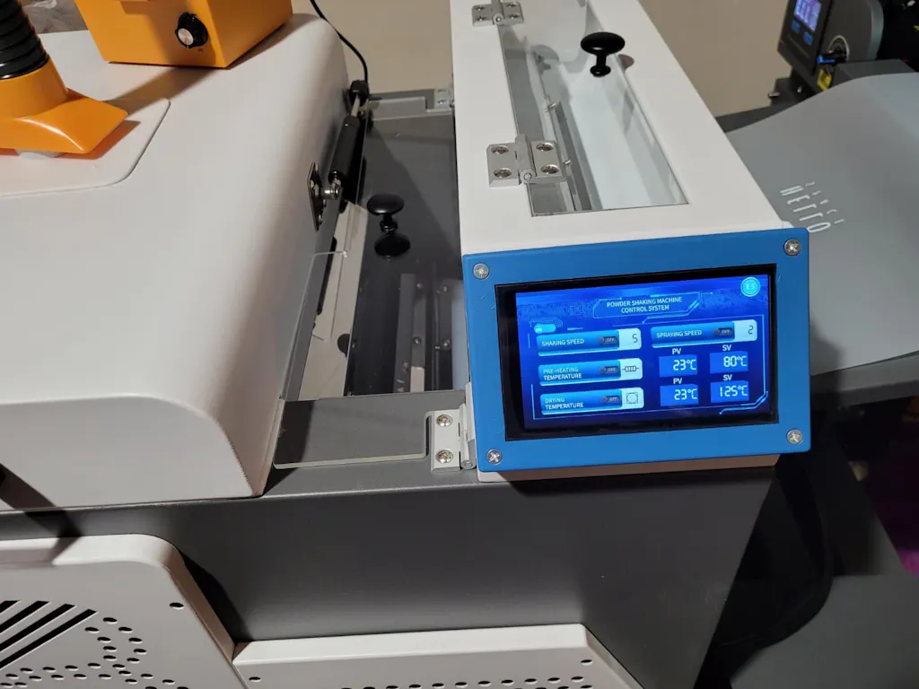 A fine adhesive powder is applied on to the prints, and form a relief effect after heating and curing